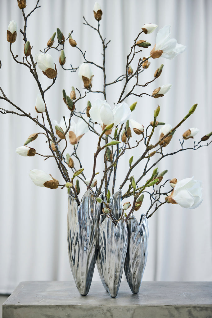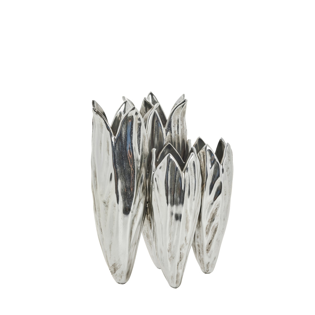 Keraamiline vaas hõbedase glasuuriga, sobib üksikute lillede või dekoratiivsete okste jaoks. Lainelise servaga disain. Kasuta vaasi üksikult minimalistliku aktsendina või kombineeri mitu vaasi omavahel.