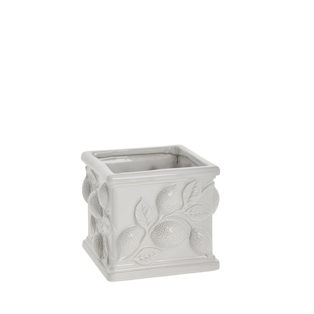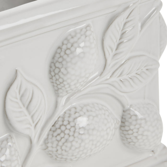 Valge keraamikast Lemon lillepott on kaunistatud skulpturaalsete sidruni- ja lehedetailidega. Detailne disain lisab tekstuuri ja sügavust, samas kui ühevärviline viimistlus annab põhjamaise ilme. Sobib nii iseseisvaks dekoratiivseks esemeks kui ka värskete taimede ja lillede hoidmiseks, tuues interjööri natuke vahemerelist meeleolu.